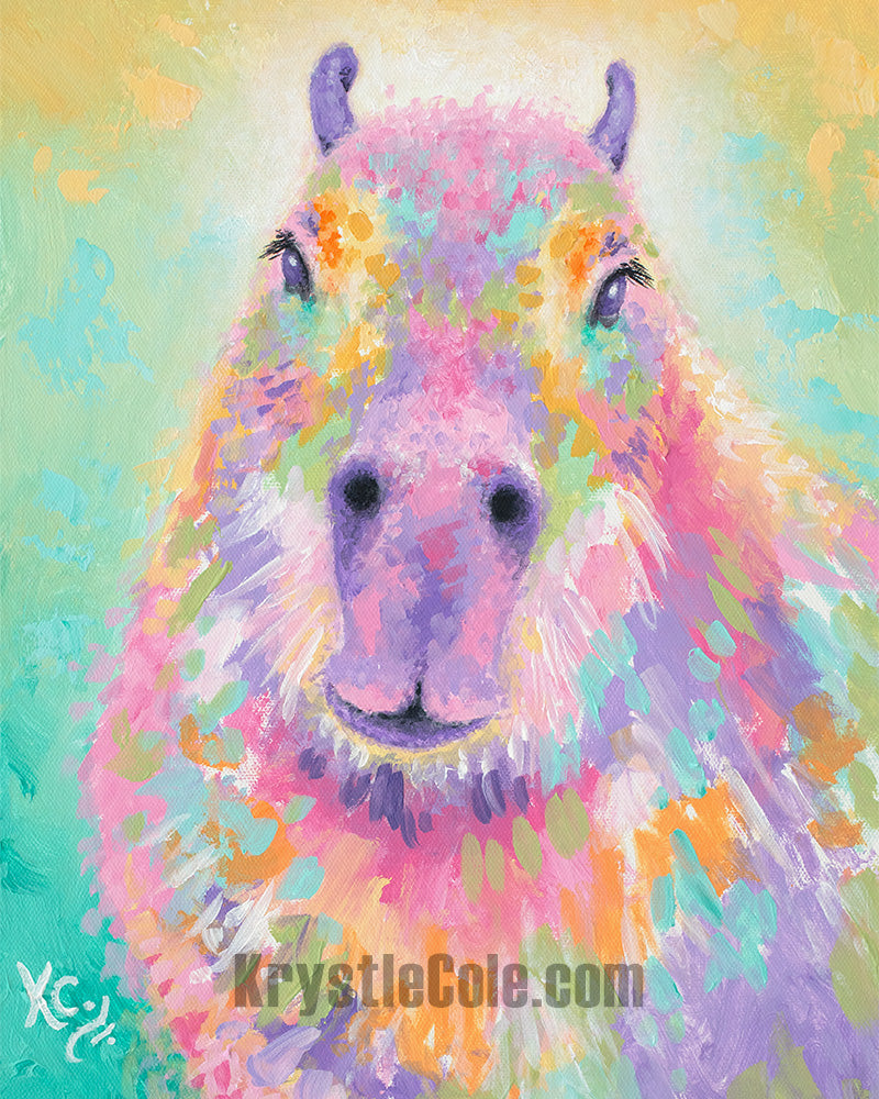 This is a fine art print on paper or ready-to-hang canvas of my capybara painting entitled Soul Spirit Capybara. I created this piece as part of my The Spirit Within collection, released in early 2025.
