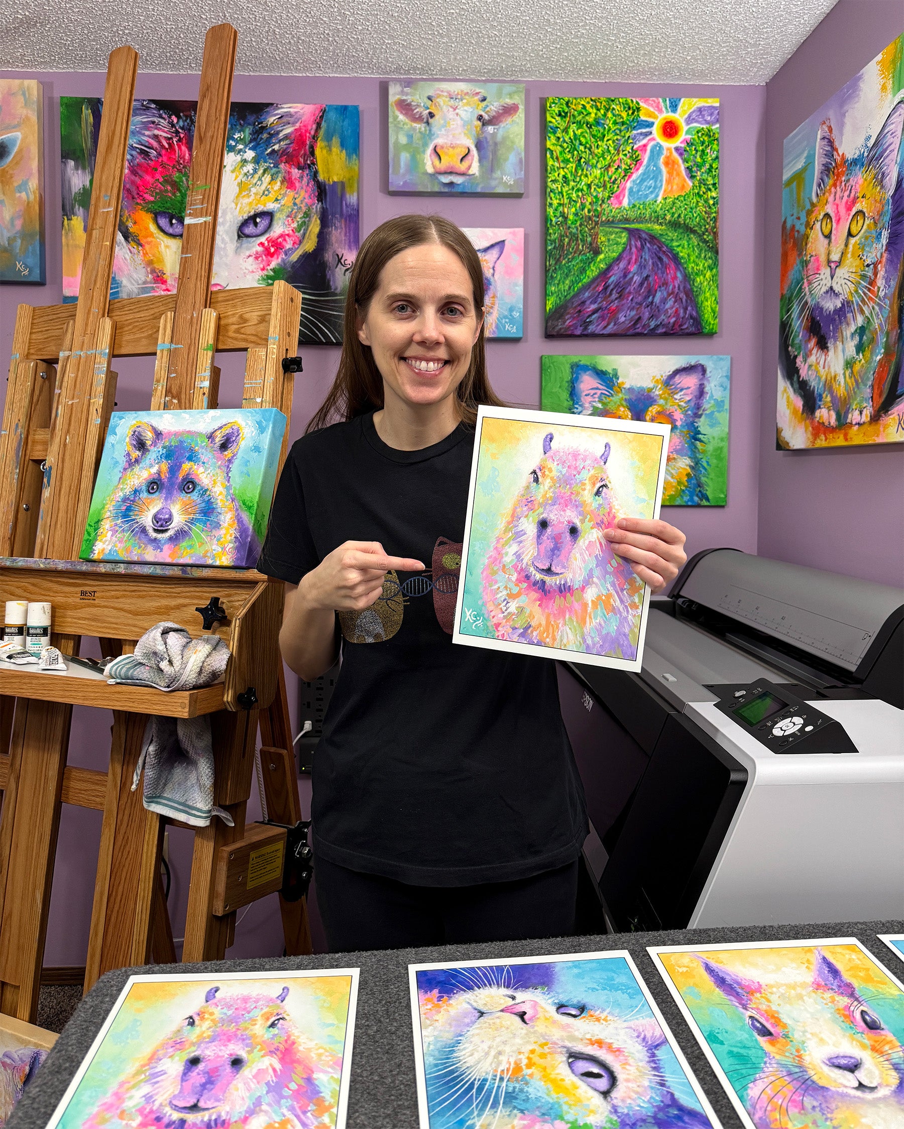 I print on Epson Surecolor professional grade printers in my home studio with archival Epson ultrachrome pigment based inks. I ensure print colors are vibrant and everything looks purr-fect :)