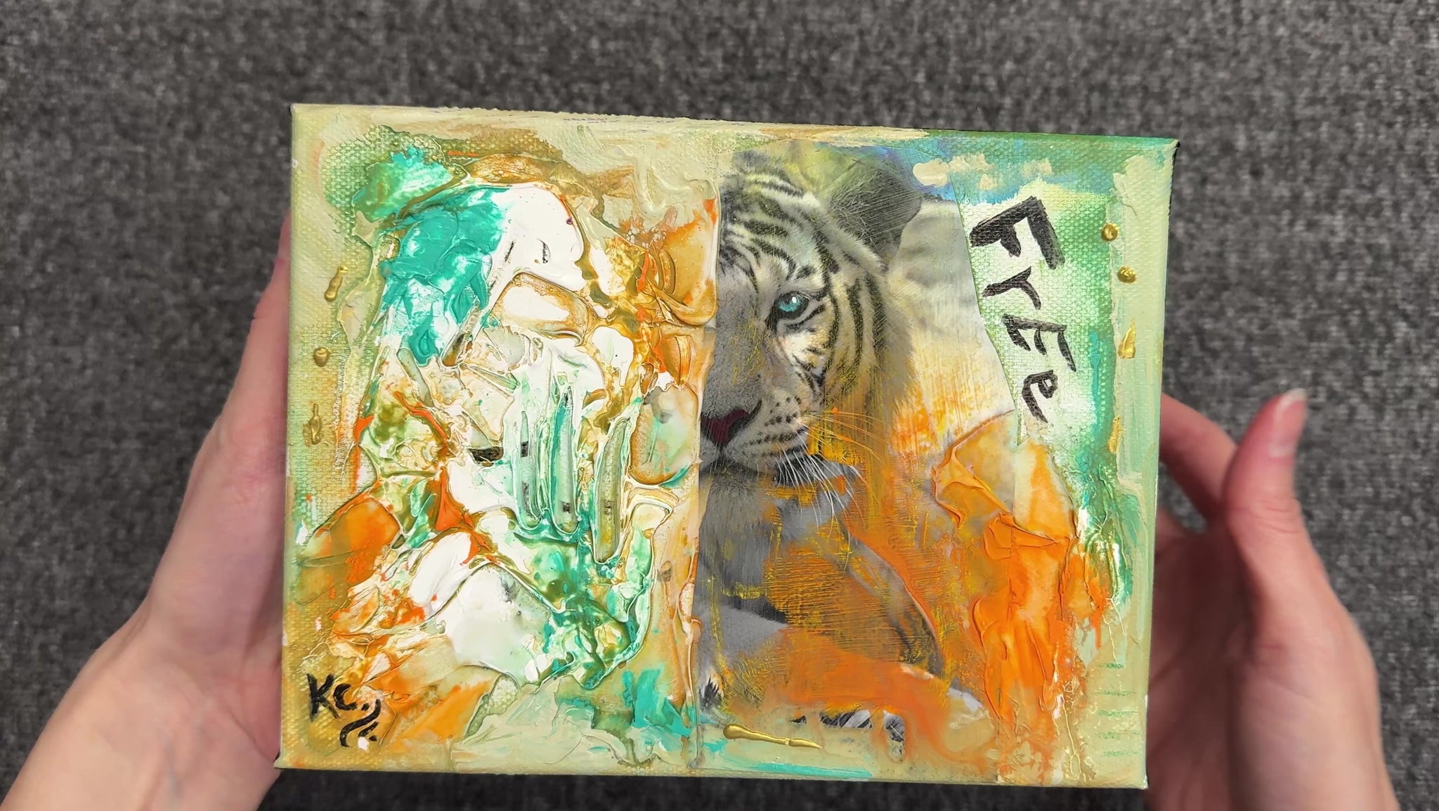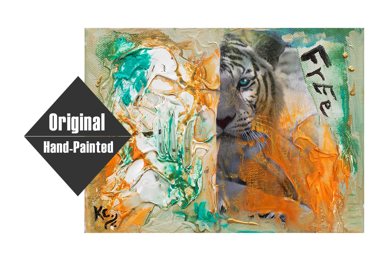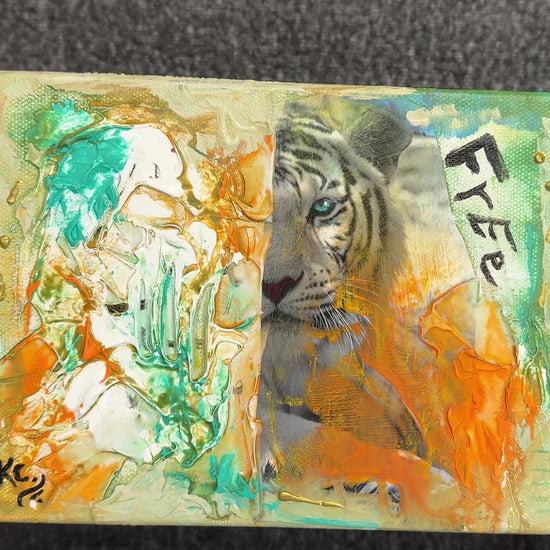 This piece features a white tiger that began as a photograph I took at Tanganyika Wildlife Park in Goddard, Kansas, which is collaged directly into the artwork. From there, the piece opens up into a more abstract exploration, with acrylic paint and colored pencil layered intuitively across the surface. Thick paint is applied using an impasto technique, creating bold, raised textures that catch the light and add physical depth. Soft greens, warm oranges, and creamy neutrals move around the collaged image, reinforcing the feeling of openness and motion, while the word free anchors the piece with a sense of release and possibility.