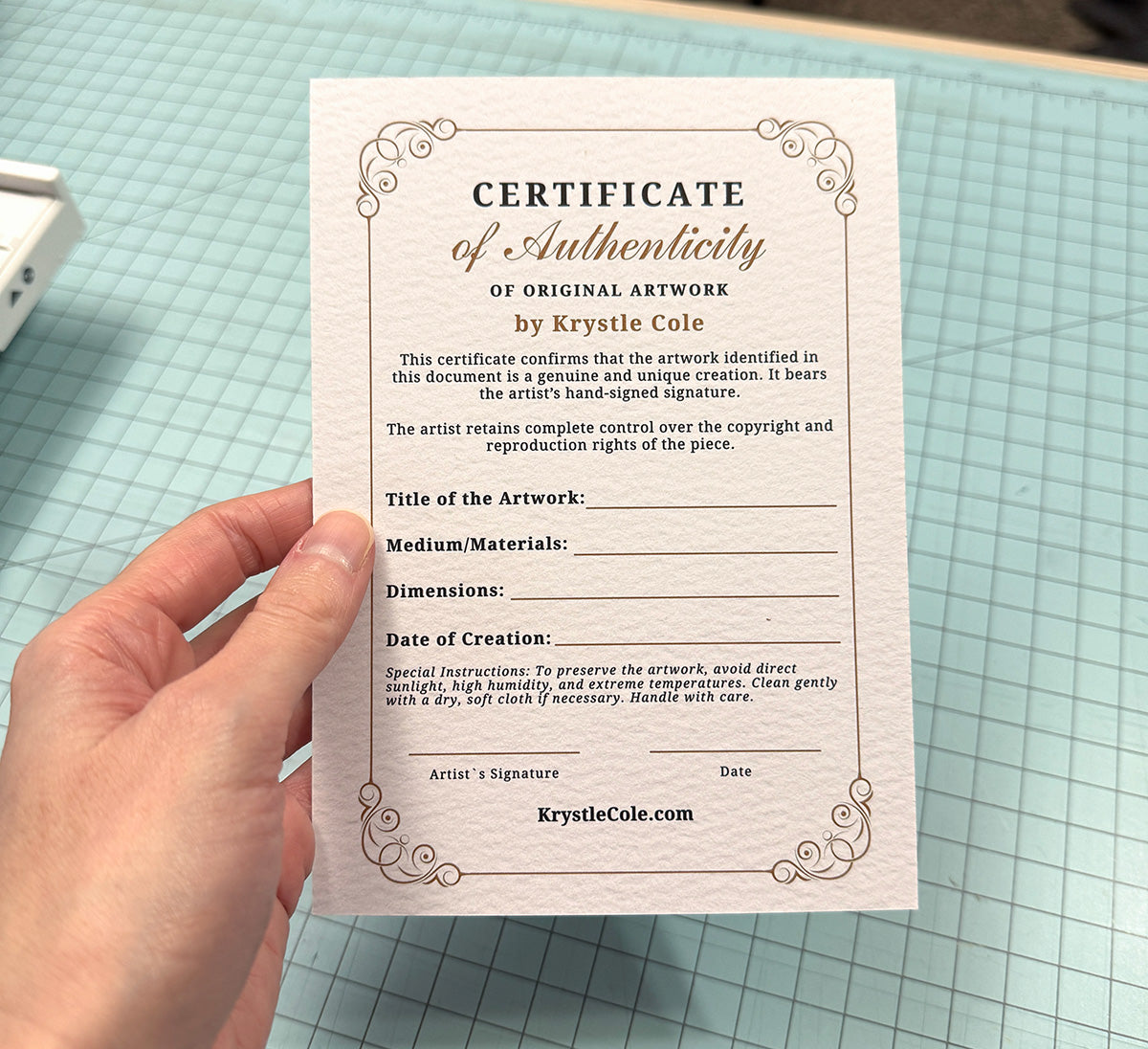 This certificate is included at no additional cost and is prepared specifically for your painting. It documents the artwork’s details and serves as a record of authenticity for your collection.