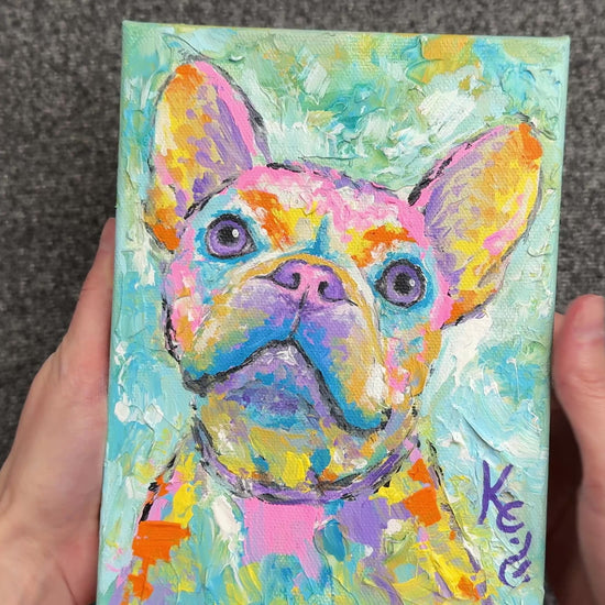 This French bulldog painting captures the curious, lovable personality Frenchies are known for, with bright playful colors and those big expressive ears. It is a small mini painting that makes a fun, feel good gift for dog lovers, or a cheerful little piece to brighten up a shelf, desk, or cozy corner of your home.