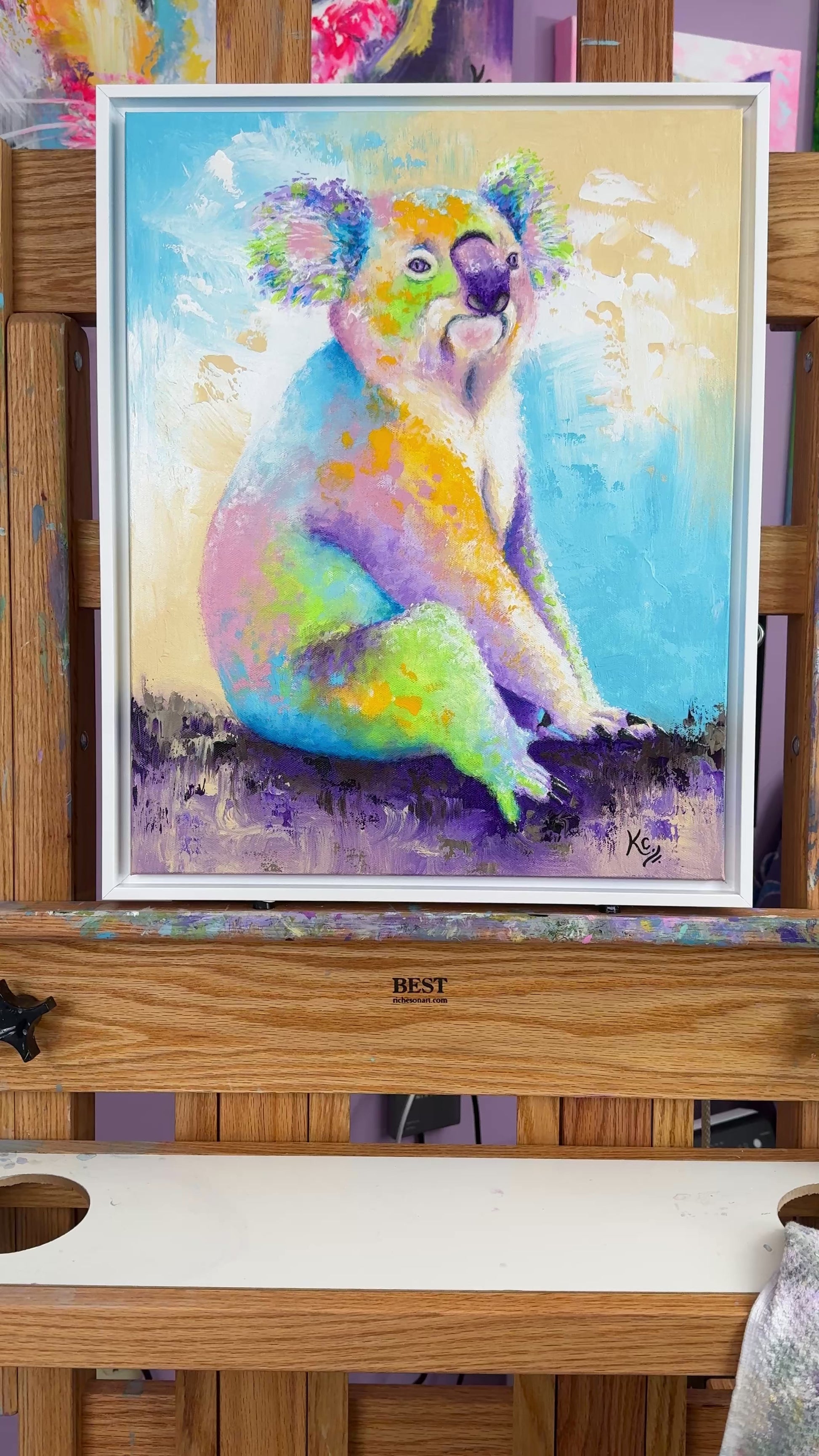 This is an original koala painting that I created in 2019. I included a detail image of the painting and a picture of me painting it along with a video showing the frame.