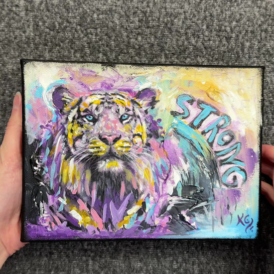 This piece features a tiger that began as a photograph I took during one of my zoo visits and collaged directly into the artwork. From there, I layered acrylic paint and colored pencil over the surface, building bold textures and expressive color. Thick paint is applied using an impasto technique, creating raised areas you can see and feel on the canvas. Purples, sky blue, yellows, and soft neutrals add energy and movement to the piece, while the word strong brings a simple, powerful message.